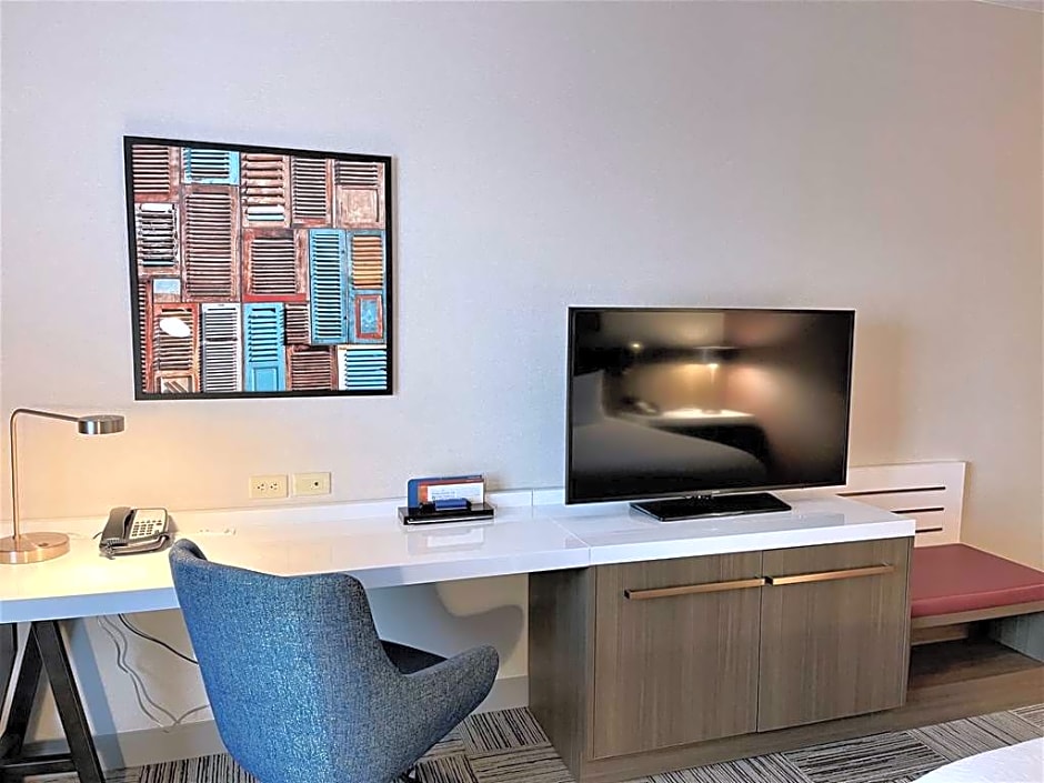 This mobility and hearing accessible standard room features one king-sized bed, and an accessible tub. The room also has a visual alarm, and notification devices for the doorbell or door knock and incoming telephone calls. Grab bar in tub with attached accessible seating, lowered vanity in bathroom, and lowered closet shelf. The ergonomic chair is good for your back and better for work. Enjoy your favorite television show on our 36-inch HDTV. There's also a microwave, refrigerator and coffee/tea maker to help you feel at home. And for conducting business, our rooms ensure your productivity thanks to the spacious work desk, two telephones with dataport and voicemail and complimentary wired and wireless high-speed internet access. Any corresponding photo may not reflect the specific accessible room type or room feature.