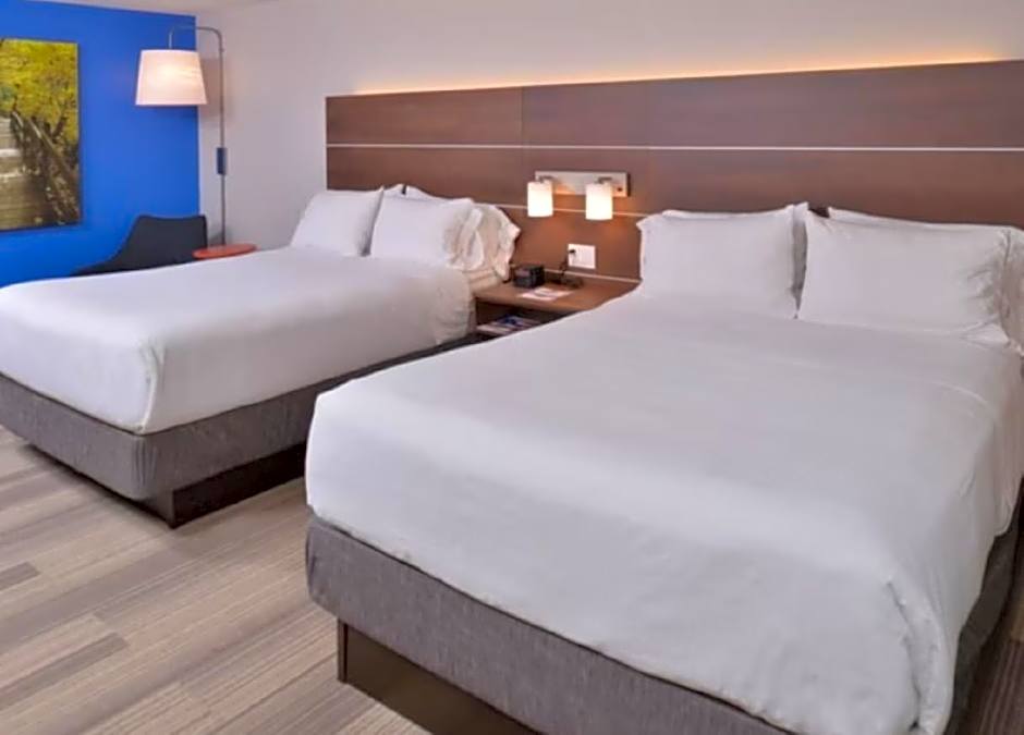 The Holiday Inn Express Hotel and Suites Stevens Point offers a King Room with a King size bed, a King Suite with a King size bed and a sofa bed, a Queen Room with Two Queen Beds (disability access), a Queen Room with Two Queen Beds, a Room Selected at Check-In with a King size bed and two Queen size beds, and a King Room with mobility access and a roll-in shower. All rooms are non-smoking and have a room size of 323 sqft. The occupancy varies, accommodating 2 adults and 1 child in some rooms, and 4 adults and 3 children in others.
