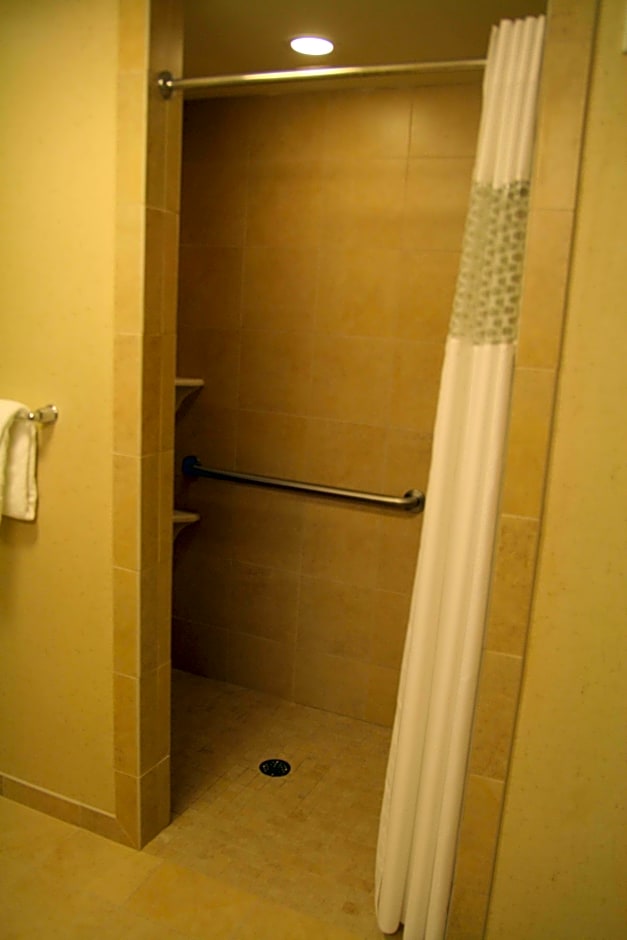 This mobility and hearing accessible, non-smoking room features one king-sized bed, and an accessible roll-in shower. The room also has a visual alarm and notification devices for the doorbell or door knock and incoming phone calls. The room features comfortable soft seating, a HDTV, and easy to operate alarm clock/radio. The free WiFi access will help you stay connected while on the road. If you prefer not to work at the desk, you can use the convenient lapdesk instead. You'll also enjoy the convenience of having a coffeemaker with tea service and iron/ironing board in your room and fridge/microwave in your room. Any corresponding photo may not reflect the specific accessible room type or room feature.