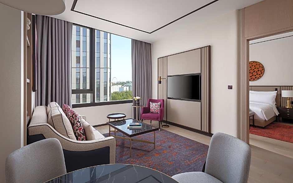 1 King Suite Club Lounge Access Amir Temur Square View is 65 square feet and includes a double bed 131-150 width plus extra beds on demand, desk, hairdryer, tea and coffee making facilities , ironing set, safe, bathrobes, and slippers.