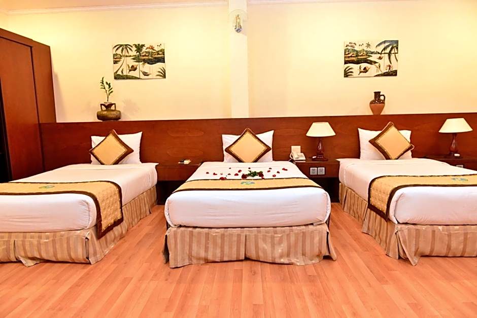 Room options cover a range of needs. The Standard Room (301 sqft) accommodates 2 adults and 1 child with a Double bed plus two Twin beds, while the Superior, 2 Twin (280 sqft) features a Queen and two Twin beds. Deluxe configurations include the Deluxe, Triple (431 sqft) for up to 3 adults and 4 children with three Twin beds, and the Deluxe Suite (431 sqft) for up to 2 adults and 1 child. Other choices include Deluxe, 1 Twin; Superior, 1 Twin; Deluxe, 2 Twin (302 sqft); and the Double Room (302 sqft). Cash, Visa, and Mastercard are accepted for payment.