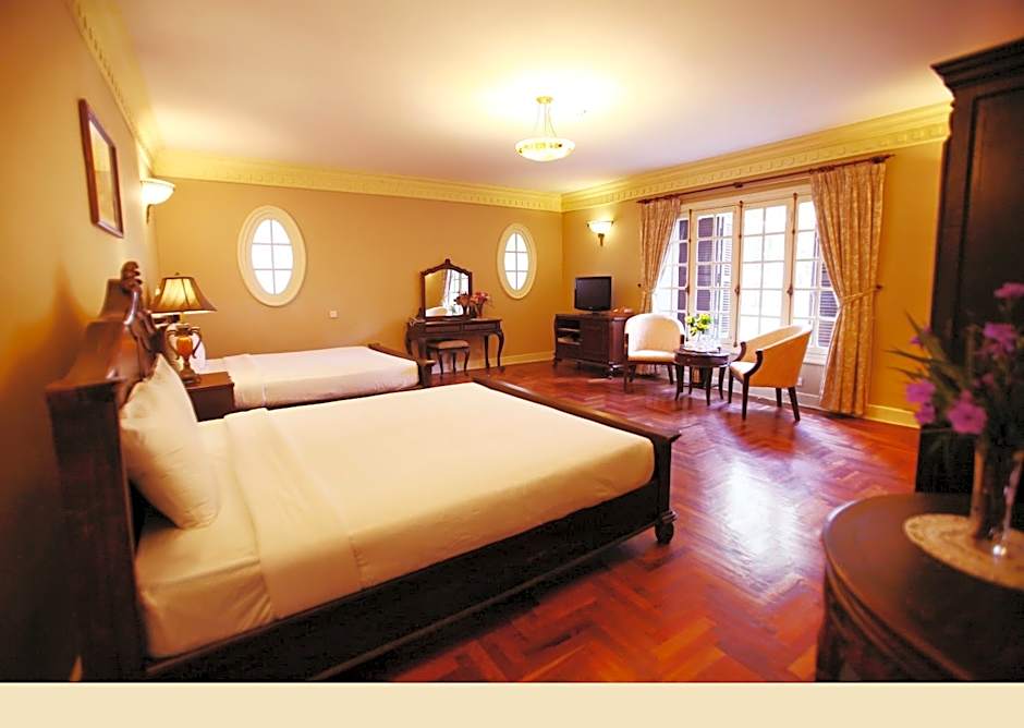 The Dalat Cadasa Resort offers a variety of rooms including Superior Double, Executive Double, Royal Double, Junior Double, Deluxe Double, Junior Twin, VIP Double or Twin, and Executive Twin. These rooms can accommodate 2 adults and 1 child, except for the Villas which can accommodate more. Smoking is not allowed in any of the rooms, with bed sizes ranging from Queen to King, and room sizes from 150 to 3767 sqft.