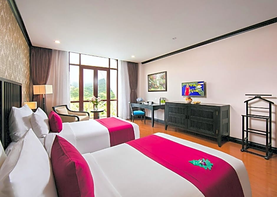 At the Swiss-Belresort Tuyen Lam, one type of room available is the Deluxe Twin Mountain View. This room features two twin beds and has a size of 377 sqft. Smoking is not allowed in this room. It can accommodate 2 adults and 2 children.