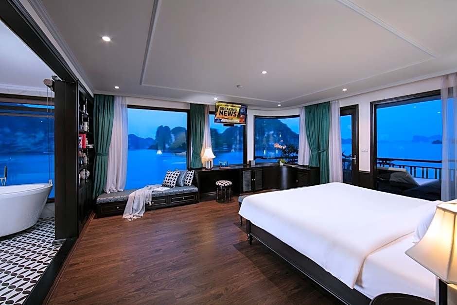Genesis Luxury Regal Cruise by Premier Group offers a 5-star escape anchored in Ha Long Bay. Docked at No 19 A, Tuan Chau Wharf, the ship sits about 6,3mi from Ha Long’s city center. Outdoor swimming pool and a Kids’ pool invite sun and splash, while beach access with free umbrellas and chairs sets a laid-back vibe. A sun deck, private balconies, and sweeping views complete the waterfront vibe.