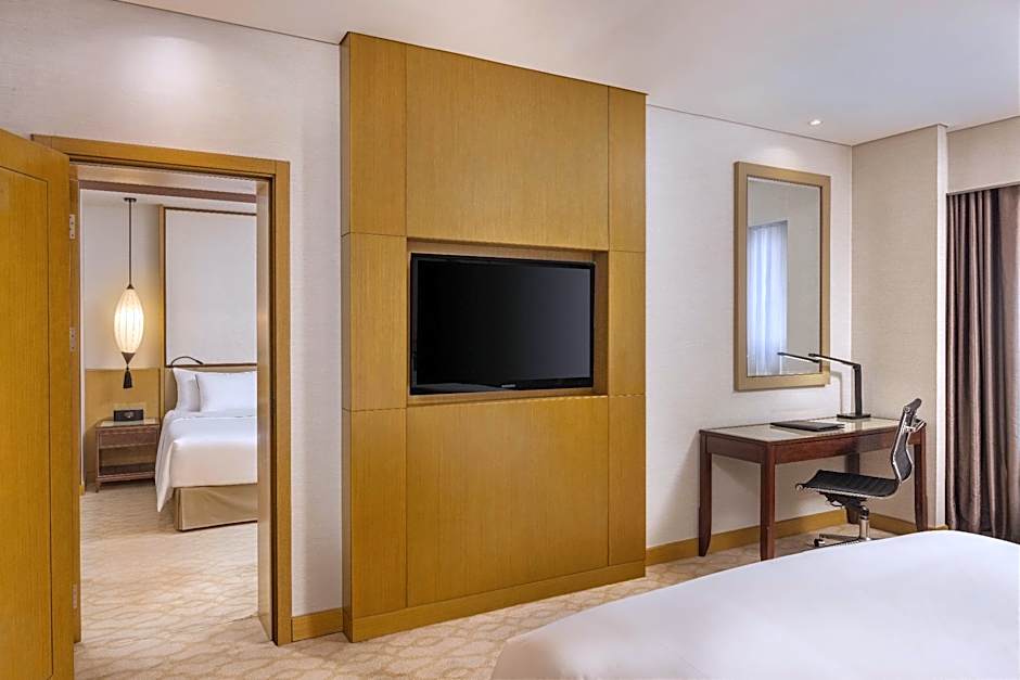 Enjoy a spacious Suite with stunning city views, a private bathroom with a bathtub, and a comfortable King size bed, perfect for 2 adults and 1 child. The room also offers additional amenities such as a minibar, flat-screen TV, air conditioning, and free toiletries, ensuring a luxurious and relaxing stay.