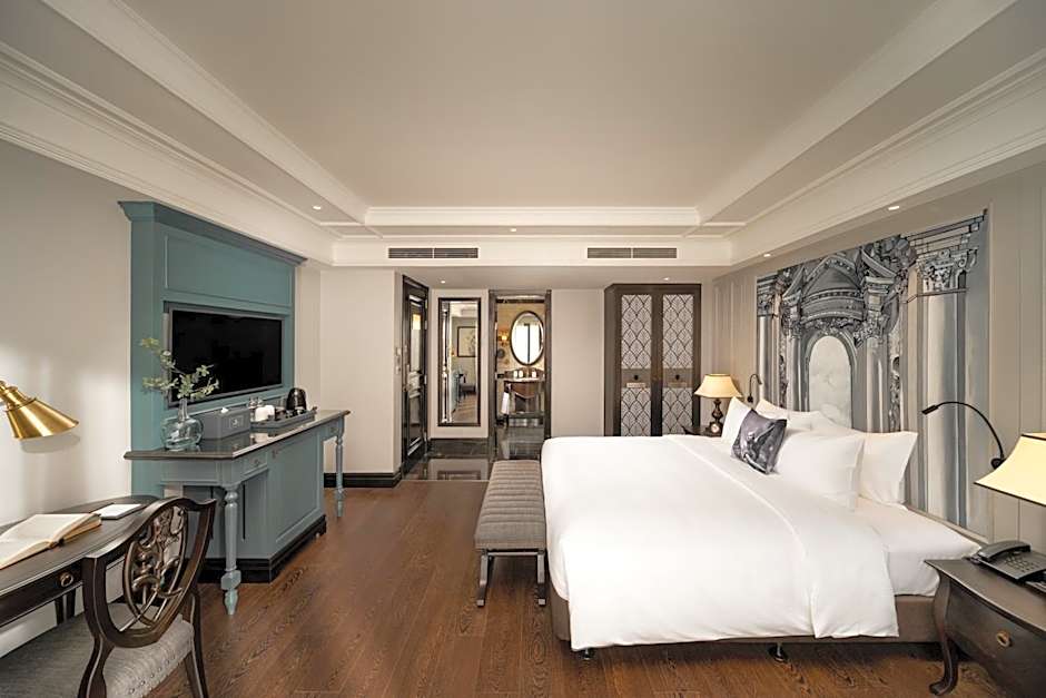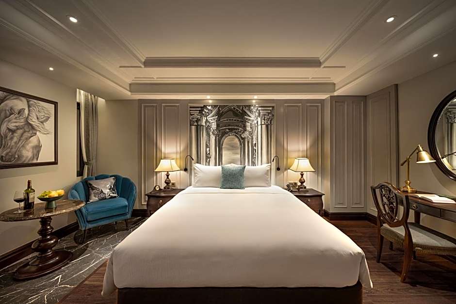 Meritel Hanoi offers a range of room types including Double, Suite, and Quadruple rooms. The rooms vary in size from 258 sqft to 592 sqft. All rooms have non-smoking policies and accommodate 2 adults, except for the Family Connecting Suite which accommodates 4 adults. The beds in the rooms range from Queen size to King size, with some rooms also offering twin beds.