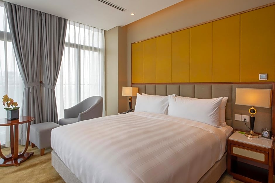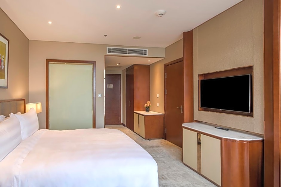 The Wyndham Garden Hanoi offers Deluxe King Rooms that are non-smoking and have a size of 301 sqft. These rooms can accommodate 2 adults and 1 child, with beds consisting of 1 Twin bed and 1 King size bed.