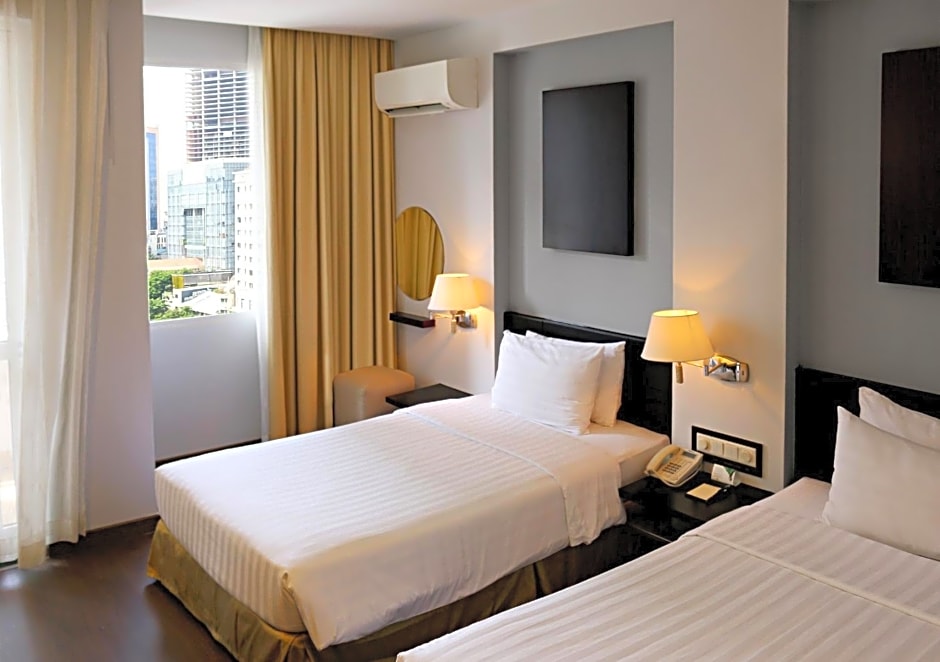 Deluxe City View Double is 258 square feet and includes a queen-size bed 150-154 width plus balcony, hairdryer, and safe.
