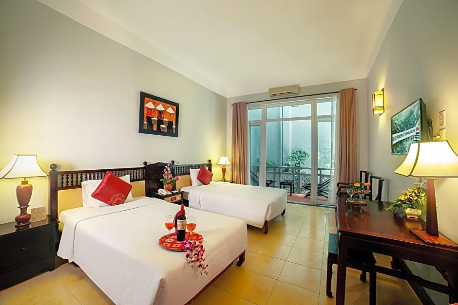 The Hoi An Beach Resort offers a variety of room types including Grand Deluxe rooms, Triple rooms with garden view, Superior Double or Twin rooms with garden view, Grand Deluxe rooms with river view, Family rooms with garden view, and Deluxe rooms with garden view. All rooms do not allow smoking and have an occupancy of either 2 adults and 1 child or 3 adults. Bed sizes vary with options of Twin beds, Queen size beds, and King size beds.
