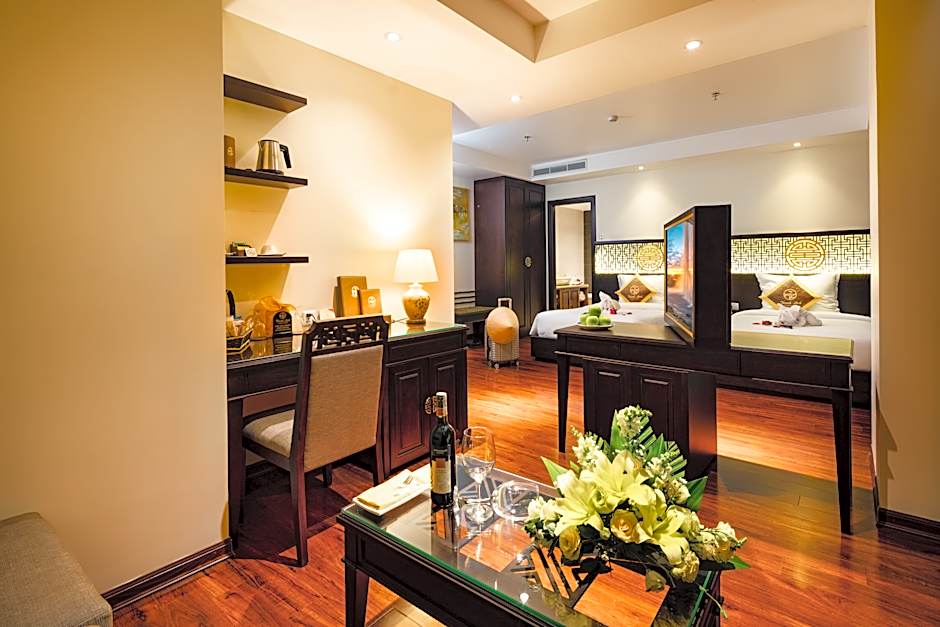 Featuring traditional Vietnamese-style decor, spacious suites offer 2 separate living areas, ample work space, a private balcony overlooking the city and 2 private bathrooms with a bathtub.